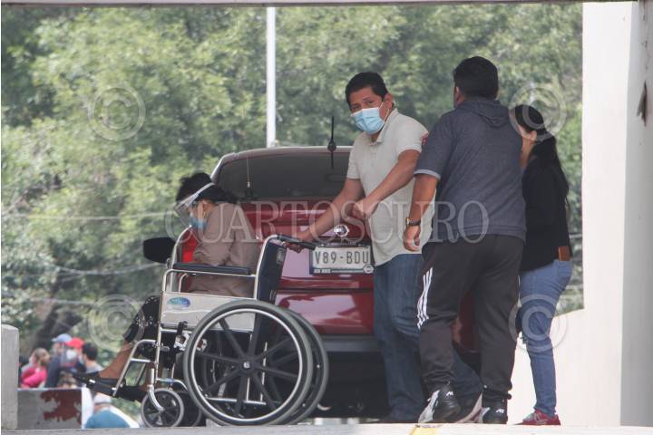 Un hombre en silla de ruedas es empujado por una mujer frente al Hospital de los Venados.