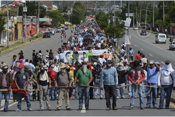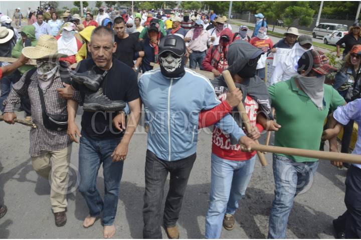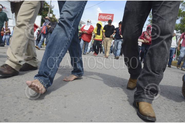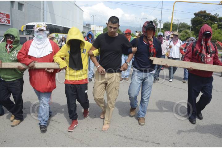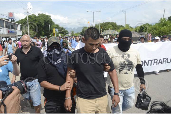 IGUALA, GUERRERO, 22OCTUBRE2014.- Dos presuntos agentes de la Secretaría de Gobernación fueron detenidos en por Profesores integrantes de la Coordinadora Estatal de Trabajadores de la Educación de Guerrero CETEG, UPOEG y estudiantes de la normal rural de Ayotzinapa , así como normalistas de todo el estado, quienes marcharon para exigir la presentación con vida de los 43 estudiantes desaparecidos de Ayotzinapa. Los detenidos marcharon junto con los normalistas descalzos. FOTO: BERNANDINO HERNÁNDEZ /CUARTOSCURO.COM