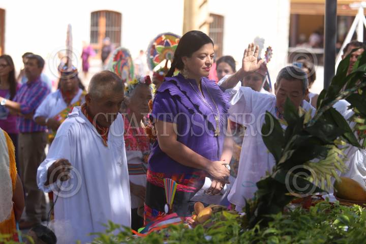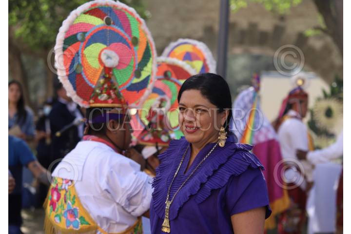 La secretaria de Cultura federal, Alejandra Frausto Guerrero durante la ceremonia de las Mujeres voladoras de Cuetzalan, en el Complejo Cultural de Los Pinos.