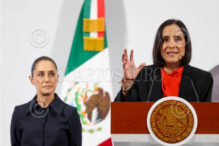 CIUDAD DE MÉXICO, 21AGOSTO2025.- Claudia Sheinbaum Pardo, presidenta de México, conversa con Luz Elena González Escobar, secretaria de Economía, durante la presentación del Plan de Expansión Energética 2025-2030, el cual contempla el fortalecimiento de la infraestructura para garantizar la distribución de energía eléctrica a nivel nacional, durante la Mañanera del Pueblo, en Palacio Nacional. FOTO: MOISÉS PABLO/CUARTOSCURO.COM