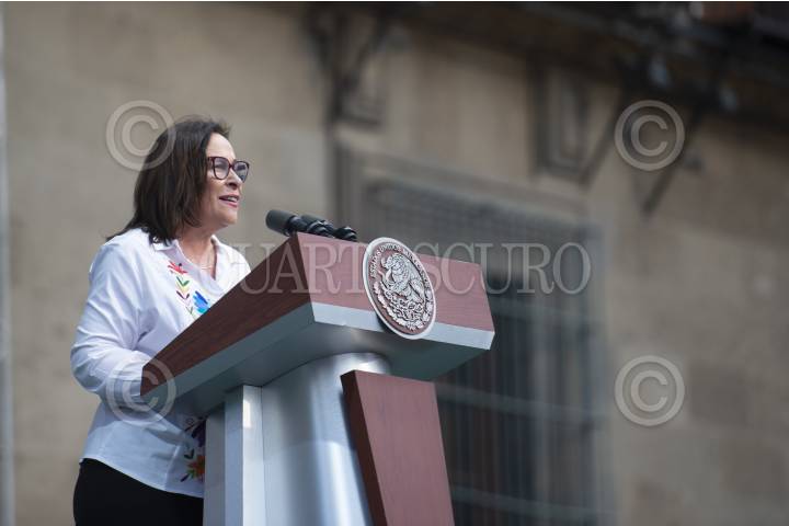 Rocío Nahle García, secretaria de Energía, durante su participación en la ceremonia del 85 Aniversario de la Expropiación Petrolera realizada en el Zócalo capitalino