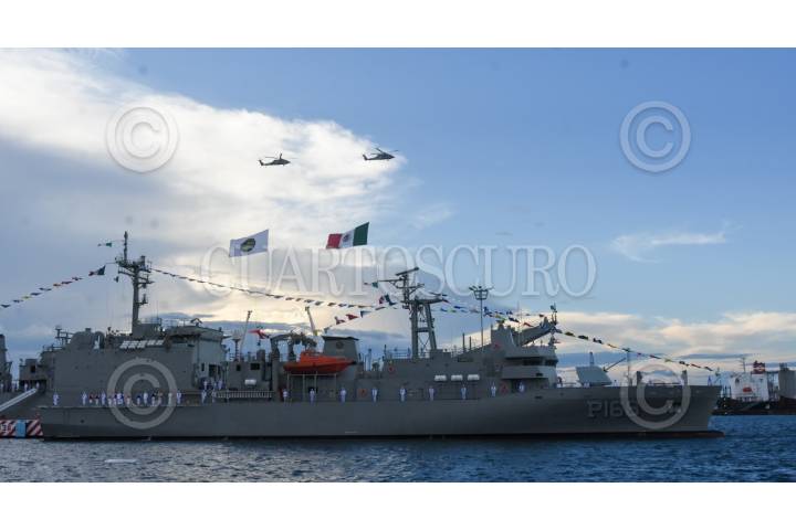 Elementos de la Armada de México protagonizaron un desfile por tierra, aire y mar para conmemorar los 200 años de fundación, en el Puerto de Veracruz. En la imagen el Buque Tabasco.