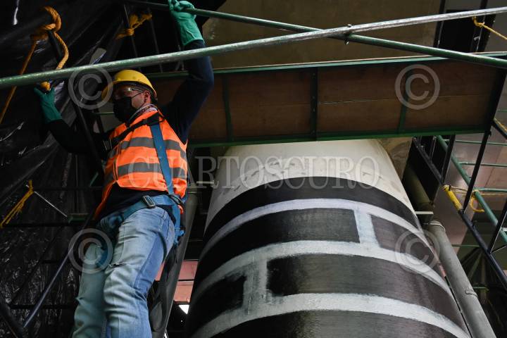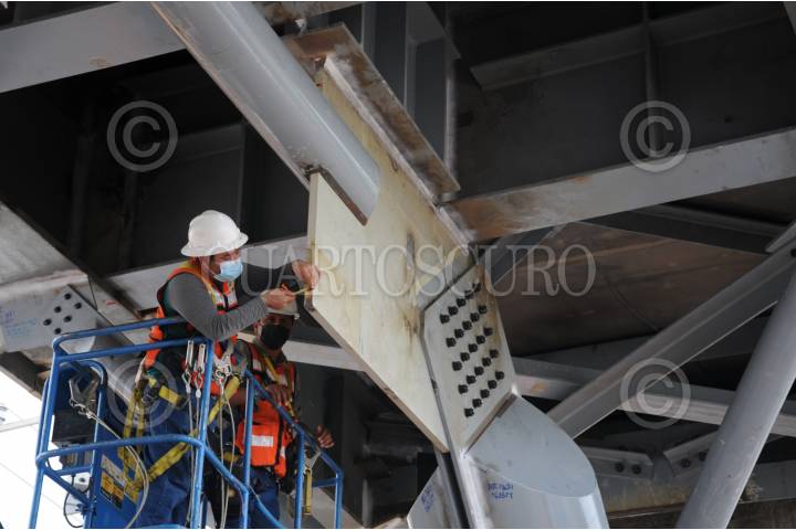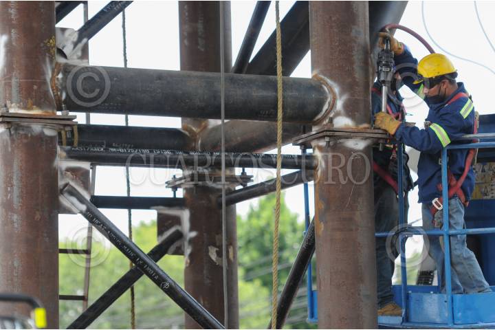 Ensamble de un andamio que será el soporte de las nuevas piezas que serán colocadas en los soportes recién realizados en la parte alta de esta línea.