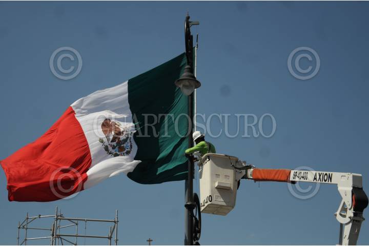 Un trabajador de obras revisa una de las luminaria del Zócalo.