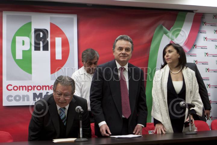 MÉXICO, D.F., 16FEBRERO2012.- Cesar Augusto Santiago, Miguel Ángel Osorio Chong, el diputado Francisco Rojas, el senador Pedro Joaquin Codwell, presidente nacional del PRI; Cristina Díaz, secretaria general del PRI, y los diputados Sebastian Lerdo de Tejada, Eduardo Sanchez Hernandez y Jorge Carlos Ramírez Marín durante una conferencia de prensa que ofrecieron a medios de comunicación en el CEN del PRI. FOTO: RODOLFO ANGULO/CUARTOSCURO.COM