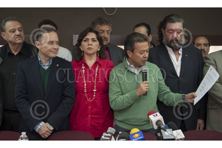 MÉXICO, D.F., 24MARZO2014.- Cesar Camacho Quiroz, presidente del PRI, acompañado de Manlio Fabio Beltrones coordinador del PRI en la Cámara de Diputados y Emilio Gamboa Patrón, coordinador del PRI en el Senado de la República en conferencia de prensa dieron detalles de la iniciativa de ley en materia política electoral. FOTO: SAÚL LÓPEZ /CUARTOSCURO.COM