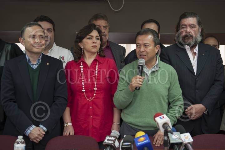 MÉXICO, D.F., 24MARZO2014.- Cristina Diaz, senadora, Cesar Camacho Quiroz, presidente del PRI, Manlio Fabio Beltrones coordinador del PRI en la Cámara de Diputados y Emilio Gamboa Patrón, coordinador del PRI en el Senado de la República en conferencia de prensa dieron detalles de la iniciativa de ley en materia política electoral. FOTO: SAÚL LÓPEZ /CUARTOSCURO.COM