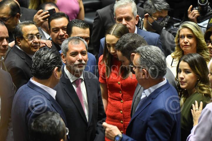 CIUDAD DE MÉXICO, 12MARZO2025.- Édgar Amador Zamora, durante la sesión ordinaria de la Cámara de Diputados fue ratificado como Secretario de Hacienda y Crédito Público. En la imagen, el nuevo secretario junto a legisladores del grupo parlamentario del PAN. FOTO: MARIO JASSO/CUARTOSCURO.COM