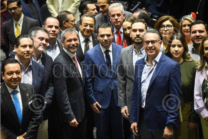 CIUDAD DE MÉXICO, 12MARZO2025.- Édgar Amador Zamora, durante la sesión ordinaria de la Cámara de Diputados fue ratificado como Secretario de Hacienda y Crédito Público. En la imagen, el nuevo secretario junto a legisladores del grupo parlamentario del PAN, encabezados por su coordinador Elías Lixa. FOTO: MARIO JASSO/CUARTOSCURO.COM