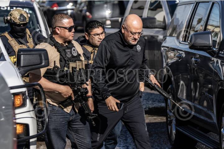 TIJUANA, BAJA CALIFORNIA, 06ENERO2024.- Minutos antes del medio día de este sábado, un agente de la policía municipal de la unidad de inteligencia, fue atacado por disparos de arma de fuego. Según información extraoficial, el policía estaba abordo de una camioneta Tacoma color gris, acompañado de una agente cuando fueron envestidos por unos sujetos que comenzaron a dispararle. Los responsables dispararon desde un vehículo tipo Kia, Sorento, mismo en el que trataron de huir en dirección ascendente sobre la avenida Jhonson, sin embargo uno de los responsables perdió la vida. El oficial de la policía municipal, fue trasladado abordo de la misma Tacoma hacia las instalaciones del Isstecali en el Mirador en estado crítico. Una cámara de vigilancia logró captar el exacto del ataque, donde se puede observar a la agente disparando hacia los agresores en varias ocasiones. Una gran cantidad de casquillos percutidos quedaron en la escena donde se registraron los hechos en la avenida Jhonson de la colonia Cañón Jhonson de acuerdo a los señalamientos de Servicios Periciales. La imagen muestra la llegada del Secretario de Seguridad Pública de Tijuana, José Fernando Sánchez al lugar del atentado. FOTO: OMAR MARTÍNEZ /CUARTOSCURO.COM