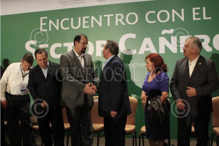 MÉXICO, D.F., 01OCTUBRE2014.- Enrique Martínez, secretario de Agricultura saluda al senador Manuel Humberto Cota en el marco del encuentro con el Sector Cañero, el secretario anunció un apoyo de mil 300 millones de pesos para apoyar a 180 mil productores de caña y con ello resarcir sus ingresos. En el encuentro cañero, al que acudieron los dirigentes de las uniones cañeras de las confederaciones Nacional Campesina, Daniel Pérez, y de la de Productores Rurales, Carlos Blackaller, el titular de la Sagarpa también acento que ya se firmó un acuerdo con Pemex para producir 190 millones de litros de etanol que se derivan de 10 millones de tonelada de caña que quedaron del ciclo 2012-2013. FOTO: MOISÉS PABLO /CUARTOSCURO.COM