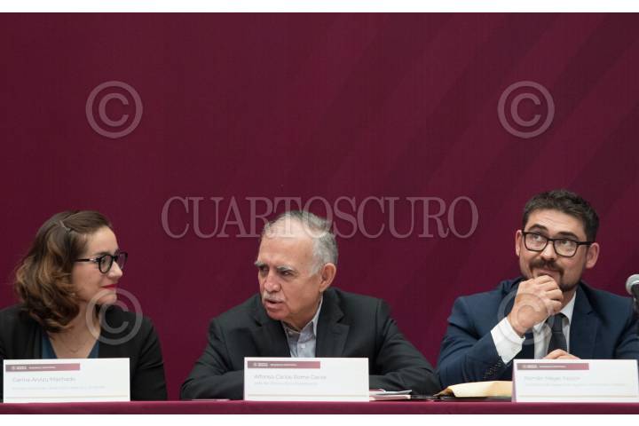 CIUDAD DE MÉXICO, 27NOVIEMBRE2019.- Carina Arvizu, Machado, subsecretaria de SEDATU, y Alfonso Romo Garza, Jefe de la Oficina de la Presidencia, y Román Meyer Falcón, secretario de Desarrollo Agrario, Territorial y Urbano (SEDATU), durante la presentación del Programa Nacional de Vivienda. FOTO: MOISÉS PABLO /CUARTOSCURO.COM