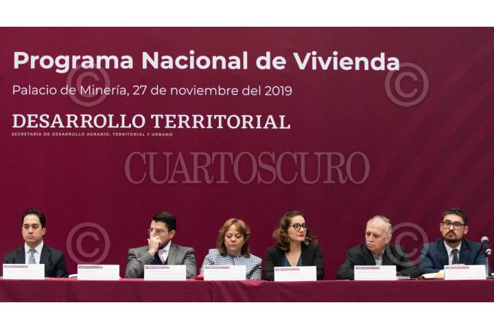 CIUDAD DE MÉXICO, 27NOVIEMBRE2019.- Carlos Martínez Velázquez, director del Infonavit; Martha Delgado Peralta, subsecretaria para Multilaterales y derechos Humanos de la SRE; Carina Arvizu, Machado, subsecretaria de SEDATU, y Alfonso Romo Garza, Jefe de la Oficina de la Presidencia, y Román Meyer Falcón, secretario de Desarrollo Agrario, Territorial y Urbano (SEDATU), durante la presentación del Programa Nacional de Vivienda. FOTO: MOISÉS PABLO /CUARTOSCURO.COM