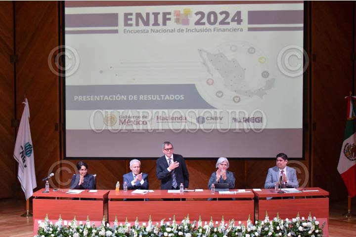 CIUDAD DE MÉXICO, 13MARZO2025.- Lucía Buenrostro, vicepresidenta de Política Regulatoria de la CNBV; Jesús de la Fuente Rodríguez, presidente de la CNBV, Édgar Amador Zamora, secretario de Hacienda y Crédito Público; Graciela Márquez, presidenta del INEGI, y Mauricio Rodríguez, director general de Estadísticas Sociodemográficas del INEGI, durante la presentación de los resultados de la Encuesta Nacional de Inclusión Financiera (ENIF) realizada en las instalaciones de Nacional Financiera. FOTO: MARIO JASSO/CUARTOSCURO.COM