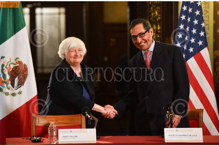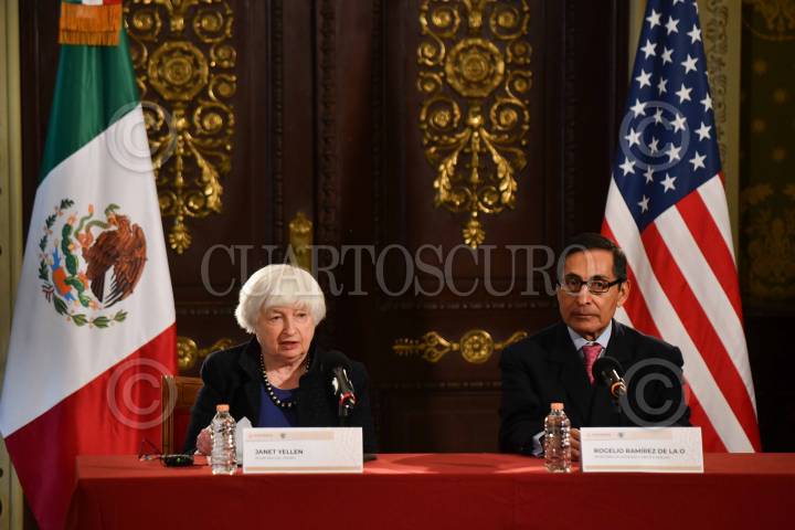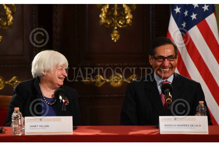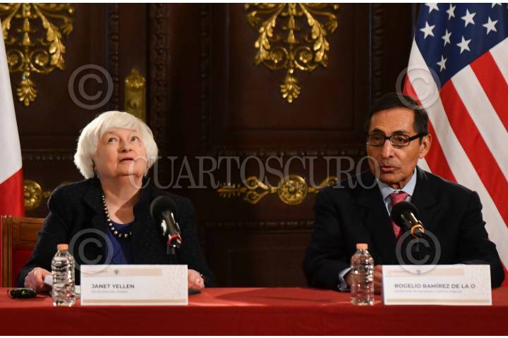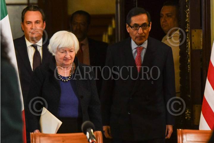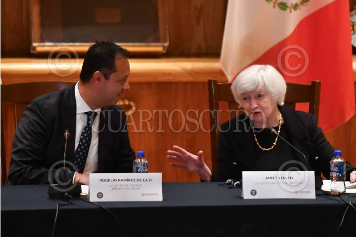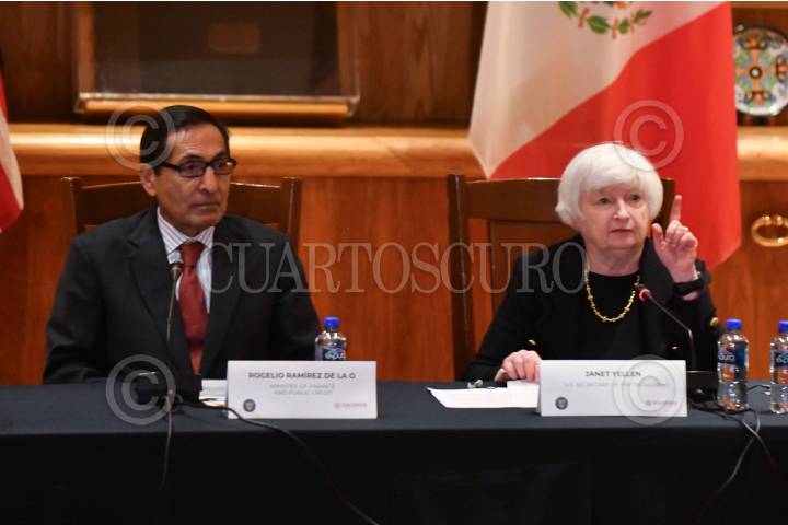 CIUDAD DE MÉXICO, 06DICIEMBRE2023.- Rogelio Ramírez de la O, secretario de Hacienda y Crédito Público, y Janet Yellen, secretaria del Tesoro de Estados Unidos, ofrecieron conferencia en las instalaciones del Club de Banqueros para informar sobre su trabajo bilateral en materia económica. FOTO: MARIO JASSO/CUARTOSCURO.COM