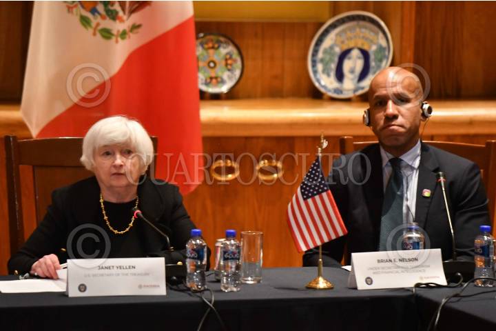 CIUDAD DE MÉXICO, 06DICIEMBRE2023.- Janet Yellen, secretaria del Tesoro de Estados Unidos,y Brian E. Nelson, Subsecretario del Tesoro para Terrorismo e Inteligencia Financiera de Estados Unidos, durante conferencia en las instalaciones del Club de Banqueros para informar sobre sus trabajo bilateral en materia económica. FOTO: MARIO JASSO/CUARTOSCURO.COM