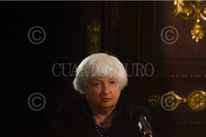 CIUDAD DE MÉXICO, 06DICIEMBRE2023.- Janet Yellen, secretaria del Tesoro de Estados Unidos, durante conferencia en el salón Panamericano de Palacio Nacional para informar sobre sus avances en la cooperación bilateral en materia de economía y seguridad. FOTO: MARIO JASSO/CUARTOSCURO.COM
