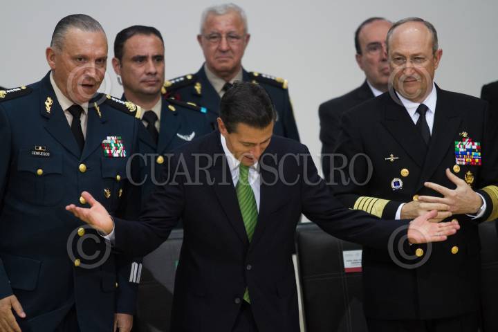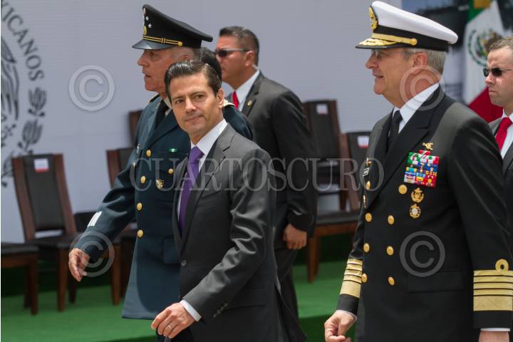 CIUDAD DE MÉXICO, 26JULIO2017.- Salvador Cienfuegos, secretario de la Defensa, Enrique Peña Nieto, Presidente de México, y Vidal Francisco Soberón Sanz, secretario de la Marina, durante la ceremonia de entrega de menciones honoríficas y reconocimiento a unidades y persona del Ejército, Armada y Fuerza Aérea, en la explanada del Campo Militar no. 1-A. FOTO: MOISÉS PABLO /CUARTOSCURO.COM