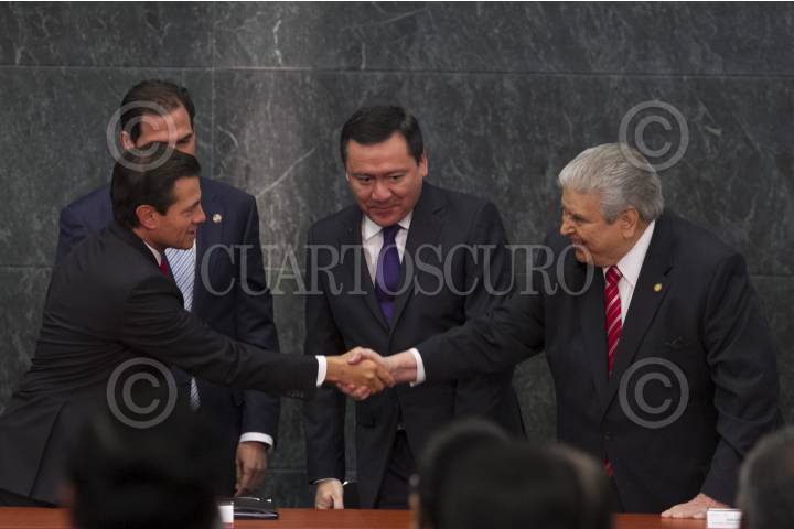 CIUDAD DE MÉXICO, 23ENERO2017.- Enrique Peña Nieto, Presidente de México; Miguel Ángel Osorio Chong, secretario de Gobernación, y Carlos Aceves del Olmo, secretario general de la CTM, durante el anuncio del posicionamiento en materia de política exterior, en la residencia oficial de Los Pinos. FOTO: MOISÉS PABLO /CUARTOSCURO.COM