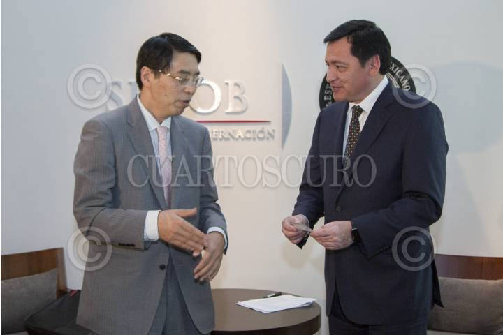 MÉXICO, D.F., 03AGOSTO2015.- Migue Ángel Osorio Chong, secretario de Gobernación, y el embajador de Japón en México, Akira Yamada, se reunieron esta tarde en las instalaciones de esta dependencia. Durante el encuentro abordaron diferentes temas, particularmente lo relativo a protección civil y atención a desastres naturales, en las cuales México y Japón han desarrollado una estrecha colaboración, como el intercambio de experiencias y conocimiento tecnológicos. FOTO: SEGOB /CUARTOSCURO.COM
