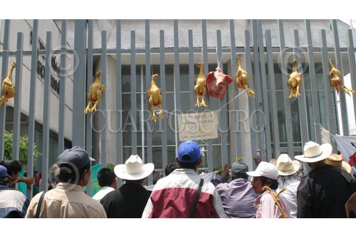 México, D.F. 31 AGOSTO 2004.- Decenas de campesinos se presentaron en la secretaría de Economía y en señal de protesta colgaron pollos y cabezas de cerdo, ya que por falta de capital no pueden desplazar sus productos. FOTO: Sandra Perdomo/CUARTOSCURO.COM