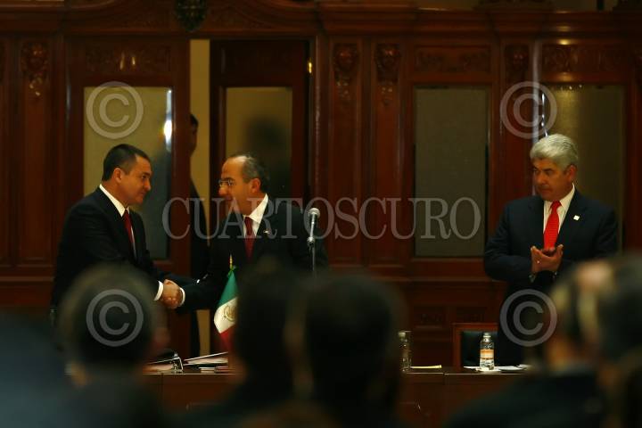 MÉXICO, D.F. 09ENERO2008.- El presidente Felipe Calderón Hinojosa, Genaro García Luna, secrtario de seguridad pública y Francisco Ramírez Acuña, secretario de gobernación durante la XII sesión del Consejo Nacional de Seguridad Pública en Palacio Nacional. FOTO: PAOLA HIDALGO/CUARTOSCURO.COM