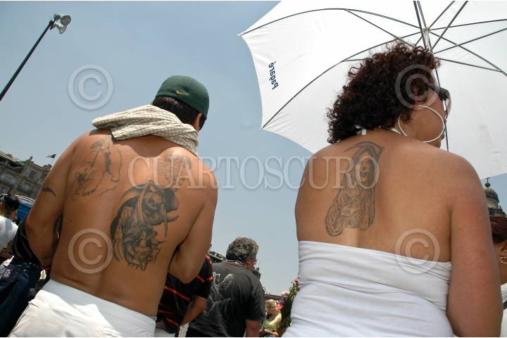 MÉXICO, D.F., 05ABRIL2009.- Dos creyentes de la "niña blanca se manifiestan junto a cientos de seguidores de la Santa Muerte alrededor del Zócalo Capitalino gritando consignas en contra del cardenal Norberto Rivera como protesta contra los ataques de la Iglesia católica, que la acusa de ser una secta y estar vinculada con narcotraficantes. FOTO: RODOLFO ANGULO/CUARTOSCURO.COM