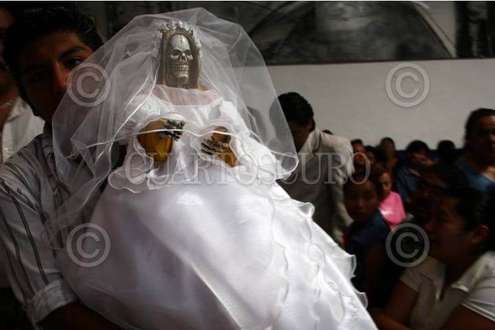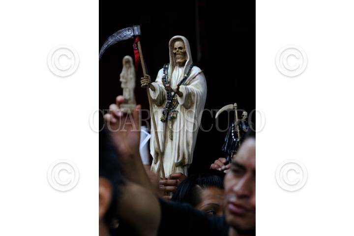 PUEBLA, PUEBLA, 05MARZO2010.- Como parte de las actividades de la iglesia de la Santa Muerte se realiza una misa mensual en las calles del centro de la ciudad en donde cientos de fieles acuden con sus "Niñas" a la misa ofrecida en su honor. FOTO: FRANCO/CUARTOSCURO.COM
