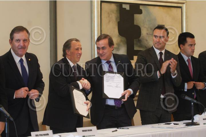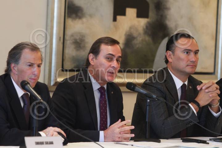 CIUDAD DE MÉXICO, 13MAYO2016.- En la imagen, José Antonio Meade, secretario de Desarrollo Social, y Juan Pablo Castañón, presidente del Consejo Coordinador Empresarial (CCE), y Manuel Herrera Vegay, presidente de la Confederación de Cámaras Industriales (Concamin), durante la firma del convenio de colaboración entre ambas instituciones posterior al consejo en el Club de Industriales. FOTO: MARÍA JOSÉ MARTÍNEZ /CUARTOSCURO.COM