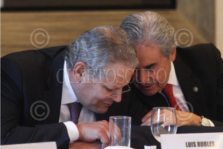 CIUDAD DE MÉXICO, 13MAYO2016.- En l aimagen, Luis Robles, de la Asociación Mexicana de Bancos, y José Méndez, durante la firma del convenio. José Antonio Meade, secretario de Desarrollo Social, y Juan Pablo Castañón, presidente del Consejo Coordinador Empresarial (CCE), firmaron un convenio de colaboración entre ambas instituciones posterior al consejo en el Club de Industriales. FOTO: MARÍA JOSÉ MARTÍNEZ /CUARTOSCURO.COM