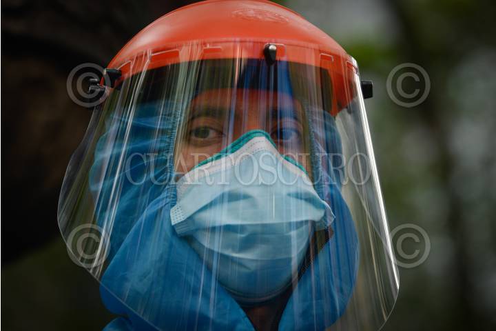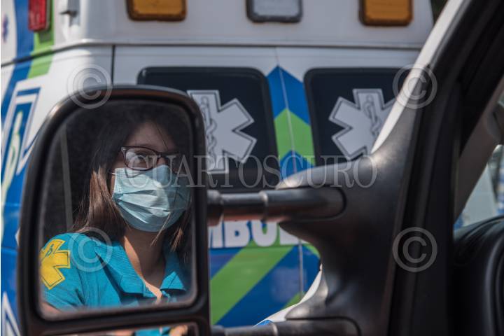 Reflejo de una mujer paramédico durante la realización de la primer "marcha sobre ruedas caravana" en apoyo y homenaje a sus compañeros hospitalizados, aislados o fallecidos durante la pandemia de coronavirus (covid-19).