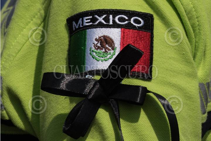 Bandera de México con un moño negro en la playera de un paramédico durante la realización de la primer "marcha sobre ruedas caravana" en apoyo y homenaje a sus compañeros hospitalizados, aislados o fallecidos durante la pandemia de coronavirus (covid-19).