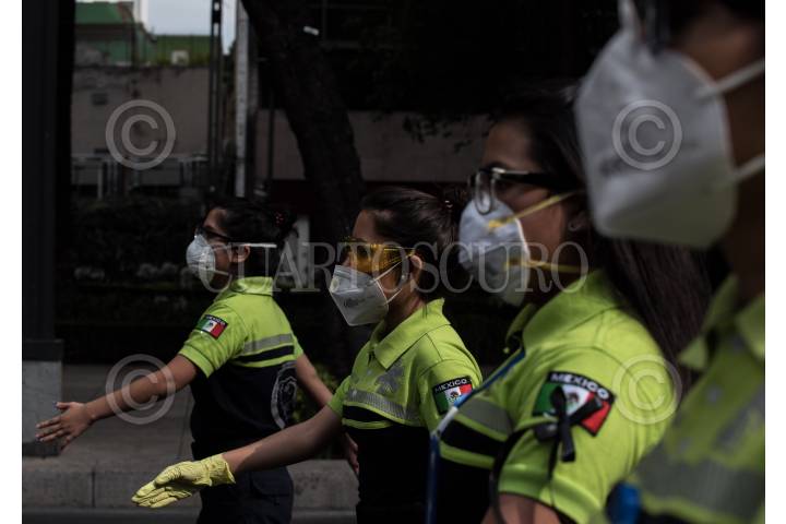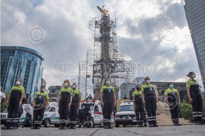 Paramédicos posan frente al Ángel de la Independencia al finalizar la primer "marcha sobre ruedas caravana" en apoyo y homenaje a sus compañeros hospitalizados, aislados o fallecidos durante la pandemia de coronavirus (covid-19).
