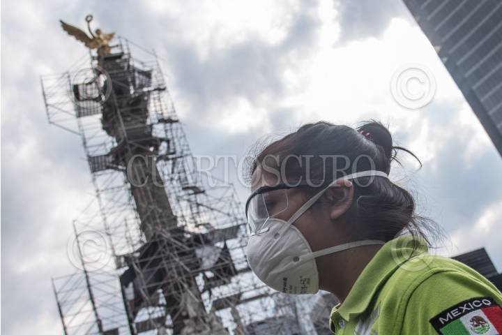 Una mujer paramédico posa frente al Ángel de la Independencia al finalizar la primer "marcha sobre ruedas caravana" en apoyo y homenaje a sus compañeros hospitalizados, aislados o fallecidos durante la pandemia de coronavirus (covid-19).