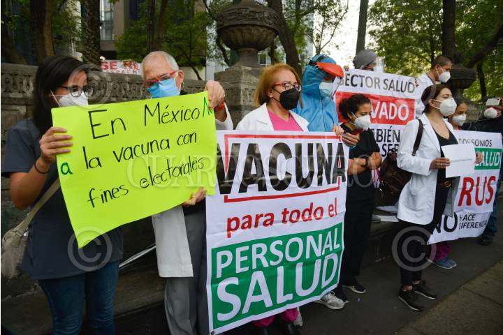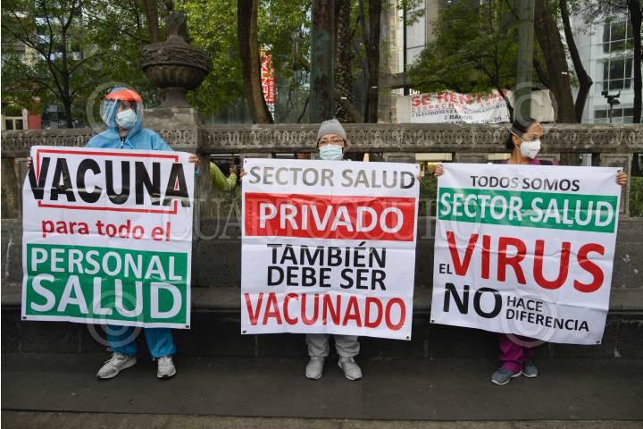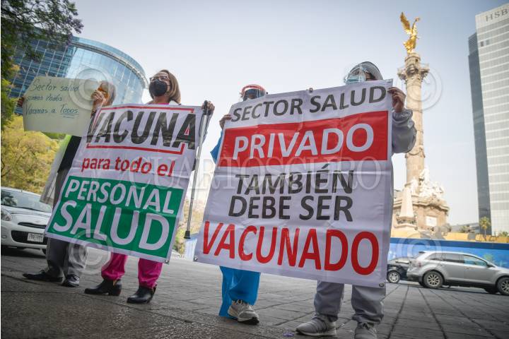 Un grupo de médicos del sector salud privado se manifestaron a un costado del Ángel de la Independencia para exigir al gobierno federal ser vacunados contra covid-19.