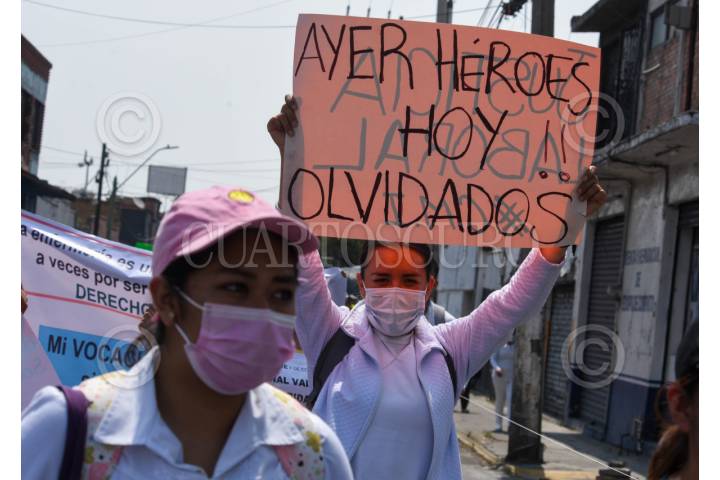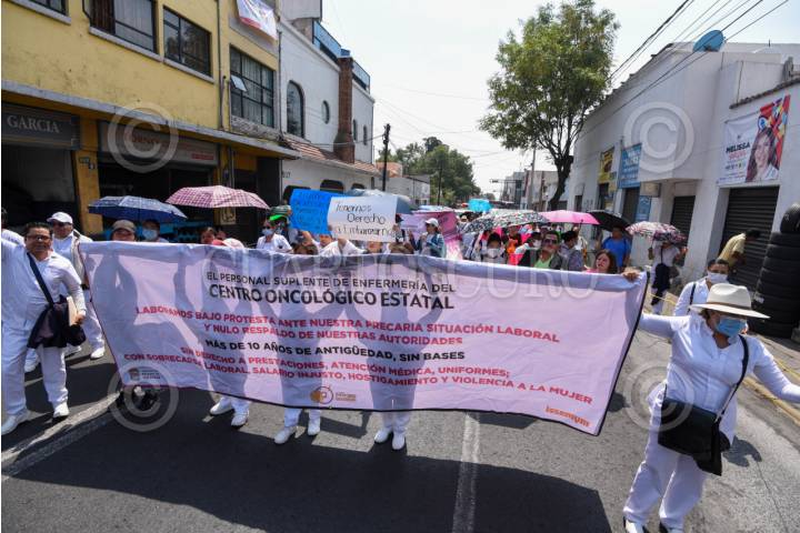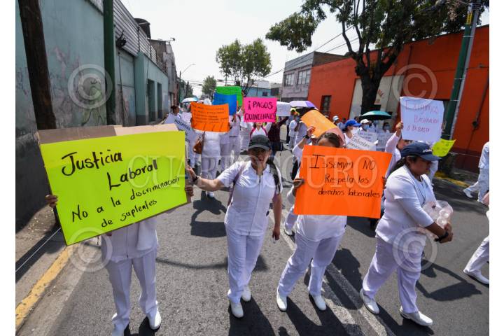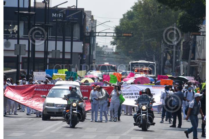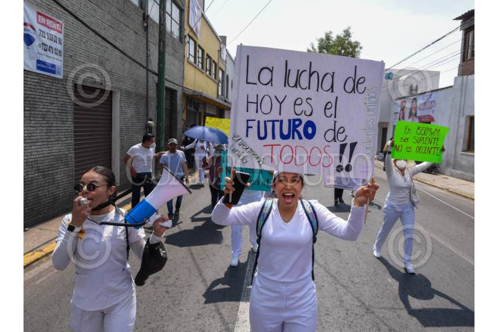 TOLUCA, ESTADO DE MÉXICO, 13MAYO2024.- Enfermeras y enfermeros suplentes del ISSEMYM caminaron en las calles de Toluca denunciando los bajos salarios que perciben, así como falta de prestaciones, no cuentan con base, carecen de seguro médico, exigen un salario digno así como el reconocimiento de su trabajo. FOTO: CRISANTA ESPINOSA AGUILAR /CUARTOSCURO.COM