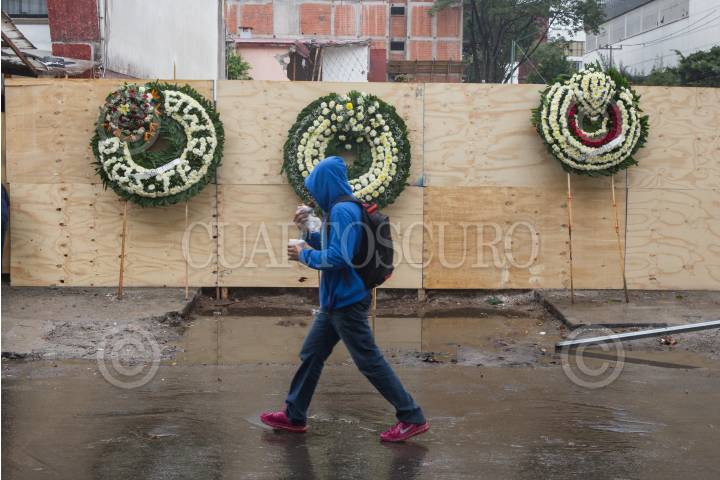 CIUDAD DEMÉXICO, 30SEPTIEMBRE207.- Transeúntes que se dirigen a sus trabajos observan las coronas florales que se colocaron en el lote de Petén y Zapata, donde colapsó un edificio por el sismode magnitud 7.1 del pasado 19 de septiembre donde fallecieron cientos de personas en la capital. FOTO: TERCERO DÍAZ /CUARTOSCURO.COM