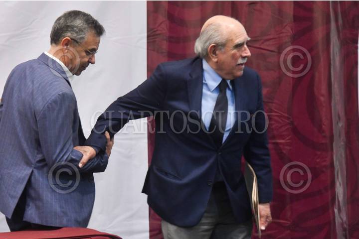 CIUDAD DE MÉXICO, 01SEPTIEMBRE2025.- Gerardo Fernández Noroña, senador de Morena, dialoga con el diputado morenista, Cuauhtémoc Blanco, durante la sesión del consejo general. FOTO: DANIEL AUGUSTO/ CUARTOSCURO.COM