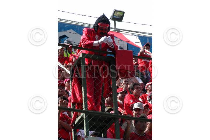 TOLUCA ESTADO DE MÉXICO 10DICIEMBRE2006._ Un seguidor disfrasado, de los Diablos Rojos medita la derrota de su equipo ante las Chivas de Gudalajara con la que se coronaron Campeónes del Torneo de Apertura con marcador de 2 a 1 en el estadio Enemesio Diez. FOTO: GUILLERMO PEREA /CUARTOSCURO.COM