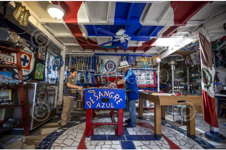 TIJUANA, BAJA CALIFORNIA, 21JULIO2018.- Don Roy Vargas se considera de “sangre azul” ya que desde temprana edad ha sido ferviente seguidor del equipo de fútbol Cruz Azul, contra viento y marea, en las buenas y en las malas. Basta con llegar a su hogar ubicado en la calle Alberto Einstein, colonia López Leyva en Tijuana para constatarlo. Junto con su familia han logrado llenar cada una de las paredes, cuartos e incluso pisos y reja de entrada en un homenaje al equipo, convirtiendo su casa en un templo, desde el más mínimo detalle hasta la casa del perro está decorado con el equipo de sus amores. Don Roy es un hombre jubilado que trabajó toda su vida en la construcción, de ahí empezó su pasión por los cementeros porque en su trabajo utilizaba el cemento Cruz Azul. Este equipo forma parte de su vida diría y es una pasión que no cambiaría por nada. FOTO: OMAR MARTÍNEZ /CUARTOSCURO.COM