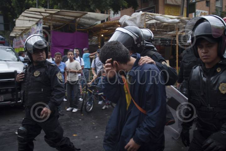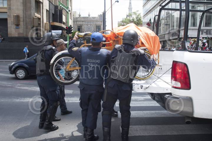 MÉXICO, D.F., 15SEPTIEMBRE2012.- Un comerciante ambulante es detenido por infringir la ley de Cultura Cívica sobre eje central, por lo que elementos de segurida pública lo remitieron con todo y triciclo a la Agencia del Ministerio Público. Con motivo del tradicional grito de Independencia, cientos de comerciantes ambulantes invadieron calles del primer cuadro. FOTO: FRANCISCO RODRÍGUEZ /CARTOSCURO.COM