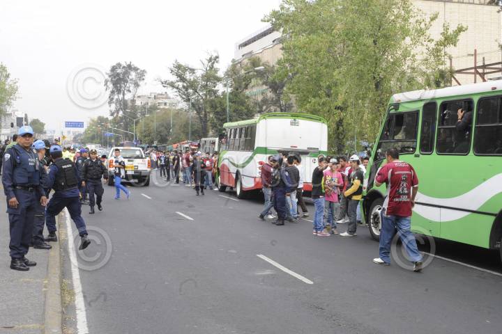 MÉXICO, D.F., 03NOVIEMBRE2012.- Porros del politécnico fueron detenidos en los camiones en los que viajaban con rumbo al estadio de Ciudad Universitaria para disfrutar del partido entre Pumas y Águilas Blancas. Esto ocurrió cuando lanzaron petardos en el cruce de Insurgentes a la altura de Puente de Alvarado en la colonia Tabacalera, de donde fueron escoltados hasta su destino. FOTO: LUIS CARBAYO /CUARTOSCURO.COM