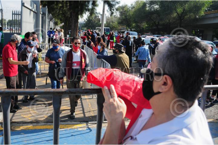 Decenas de personas esperan su turno para acceder al Palacio de los Deportes y aplicarse la segunda dosis de la vacuna contra el Covid-19.