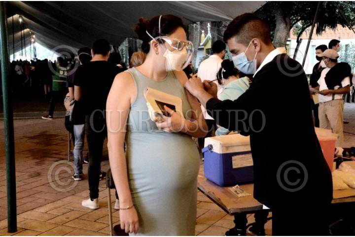 Mujer embarazada momentos antes de ser vacunada contra COVID-19 en el Estadio Olímpico.