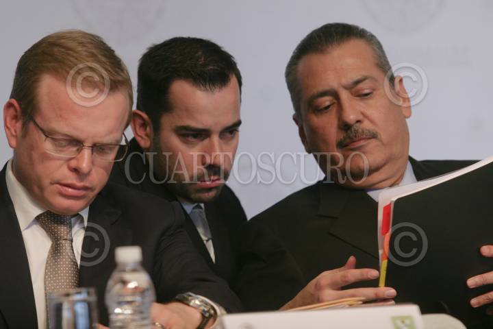 MÉXICO, D.F. 29ENERO2013.-Manlio Fabio Beltrones, coordinador parlamentario del PRI en la Cámara Baja, lee un informe durante la II Reunión Parlamentaria de las fracciones parlamentarias del PRI y PVEM en la cámara baja, llevada a cabo en un hotel de Polanco. A la izquierda el coordinador del PVEM, Arturo Escobar. FOTO: JUAN PABLO ZAMORA /CUARTOSCURO.COM