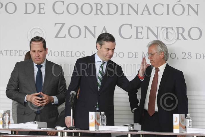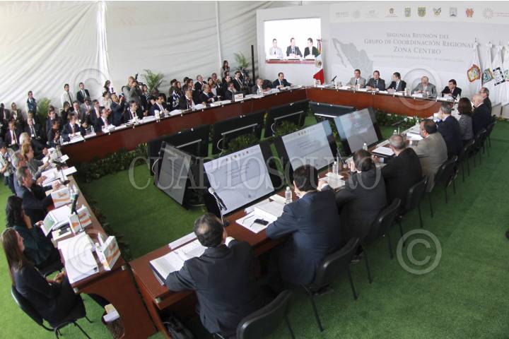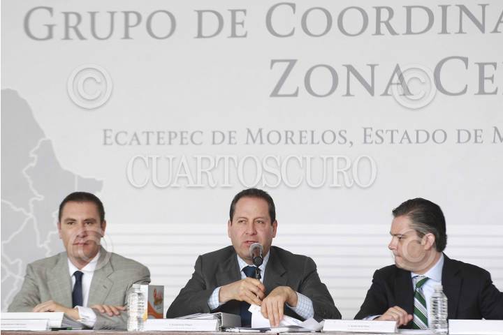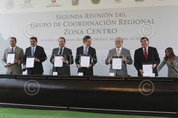 ECATEPEC, ESTADO DE MÉXICO, 28ABRIL2016.- Los gobernadores; Rafael Moreno Valle, Puebla; Francisco Olvera Ruiz, gobernador Hidalgo; Eruviel Ávila, Estado de México; Graco Ramírez, Morelos; Mariano González Zarur, Hidalgo, y Aurelio Nuño, secretario de Educación Pública, durante la segunda reunión del Grupo de Coordinación Regional Zona Centro. FOTO: CUARTOSCURO.COM