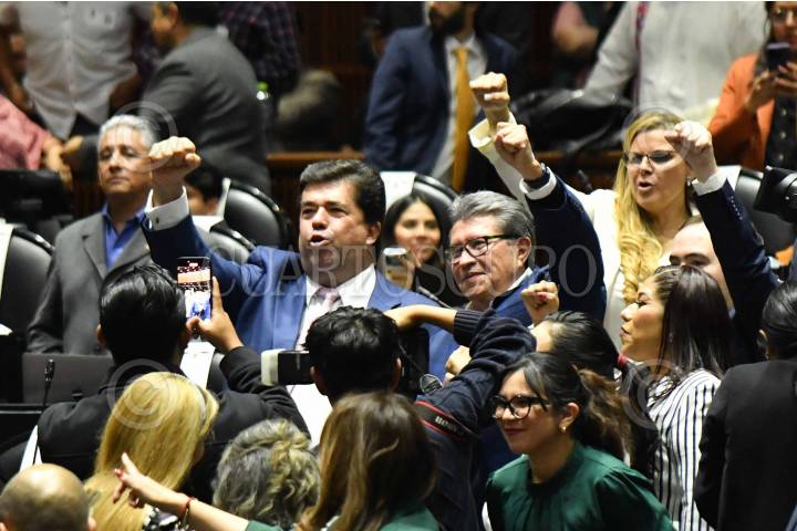 CIUDAD DE MÉXICO, 01FEBRERO2025.- Con 346 votos a favor y 90 en contra fue aprobada en lo general la reforma al INFONAVIT, durante la sesión ordinaria del Segundo Año de Ejercicio de la LXVI Legislatura del Congreso de la Unión de la Cámara de Diputados. En la imagen, Pedro Haces, diputado de Morena y Ricardo Monreal, coordinador del grupo parlamentario de Morena en diputados, celebran la aprobación. FOTO: MARIO JASSO/CUARTOSCURO.COM