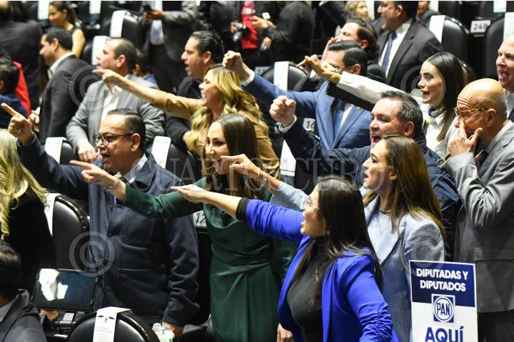 CIUDAD DE MÉXICO, 01FEBRERO2025.- Con 346 votos a favor y 90 en contra fue aprobada en lo general la reforma al INFONAVIT, durante la sesión ordinaria del Segundo Año de Ejercicio de la LXVI Legislatura del Congreso de la Unión de la Cámara de Diputados. En la imagen, diputados del PAN, gritaron "narcogobierno" y "Fuera Rocha", luego de una moción de orden generada ante la aprobación del 25% aranceles a productos mexicanos por parte del gobierno estadounidense. FOTO: MARIO JASSO/CUARTOSCURO.COM