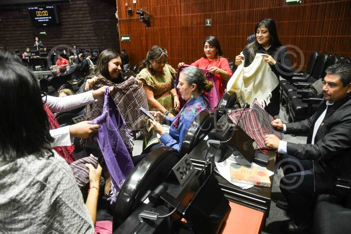 CIUDAD DE MÉXICO, 05FEBRERO2025.- Legisladoras de Morena observan rebosos fabricados en Tenancingo, Estado de México, que se ofertaron entre la bancada previo al inicio de la sesión ordinaria del Segundo Año de Ejercicio de la LXVI Legislatura del Congreso de la Unión de la Cámara de Diputados, en la que se discute y se somete a votación el listado de las personas aspirantes que resultaron insaculadas para los cargos del Poder Judicial. FOTO: MARIO JASSO/CUARTOSCURO.COM