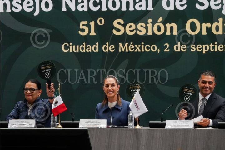 CIUDAD DE MÉXICO, 02SEPTIEMBRE2025.- Rosa Icela Rodríguez, secretaria de Gobernación; Claudia Sheinbaum Pardo, presidenta de México, y Omar García Harfuch, secretario de Seguridad Pública y Protección Ciudadana, durante la instalación de la 51ª Sesión Ordinaria del Consejo Nacional de Seguridad en Palacio Nacional a la que acudieron las y los gobernadores de los 32 estados de la República.